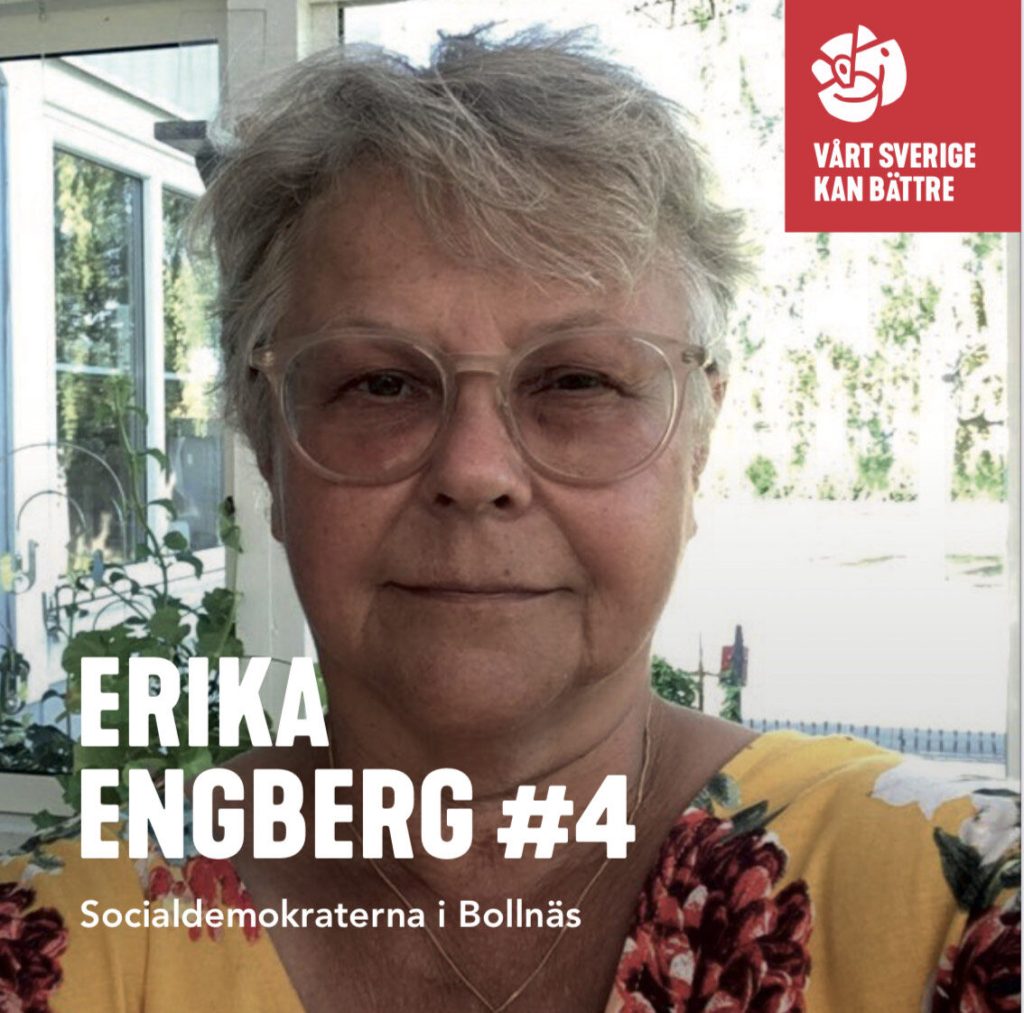 Jag heter Erika Engberg, jag är född 1961 år och har bott i Bollnäs sedan 1969. Jag började jobba inom hemtjänsten som 17-åring och blev så småningom fackligt aktiv. Jag har varit egen företagare och verksamhetschef på Bollnäs Ridsällskap under tiden 1999-2007. Återbrukas nu som ordförande sen något år. Just nu är jag ordförande i Socialnämnden. Jag är också ledamot i Kommunstyrelsen, ledamot och gruppledare S-gruppen i Kommunfullmäktige och Ordförande i Bollnäs Socialdemokratiska Arbetarekommun
